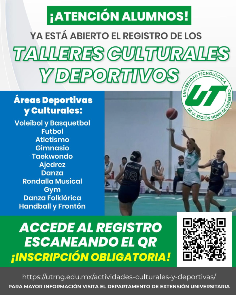 ​El Departamento de Extensión Universitaria, bajo la dirección de la Lic. Yessica García Salgado, les informa que ya se encuentra abierto el proceso de registro para los Talleres Culturales y Deportivos de este ciclo.