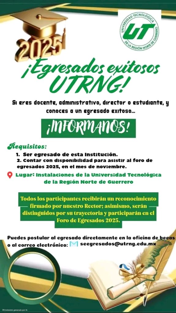 La Dirección de Vinculación, a través del Departamento de Seguimiento de Egresados, invita a toda nuestra comunidad universitaria a participar en la convocatoria “Egresados Exitosos UTRNG 2025”.