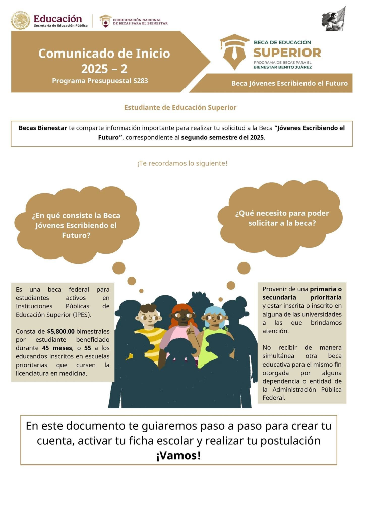 La Dirección de Vinculación, a través del Departamento de Becas, les recuerda que la información y guía completa para realizar la solicitud de la Beca “Jóvenes Escribiendo el Futuro” correspondiente al segundo semestre del 2025 ya fue publicada con anterioridad en nuestros canales oficiales.