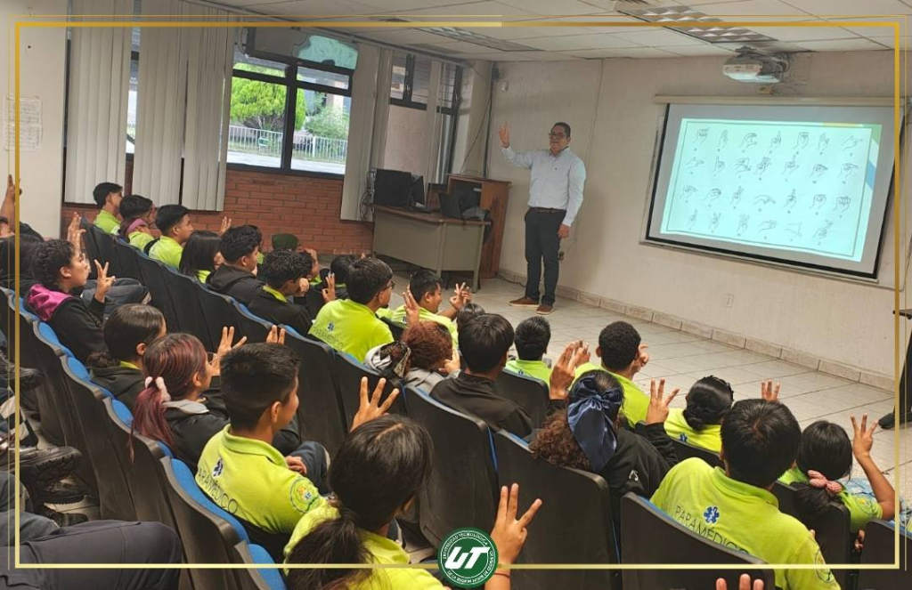 Los estudiantes del cuarto cuatrimestre de la carrera de Técnico Superior Universitario en Paramédico participaron en un valioso taller de Lengua de Señas Mexicana (LSM), impartido por el Mtro. Alberto Moreno Bahena, con el objetivo de fortalecer sus habilidades de comunicación para la atención de pacientes con discapacidad auditiva.